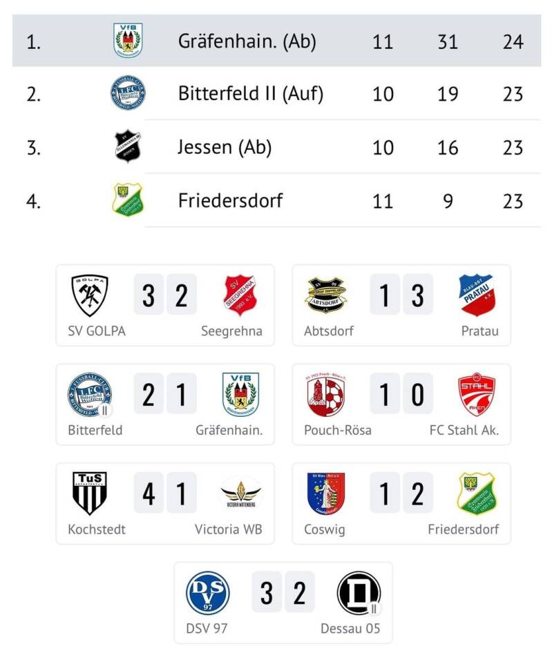 Etwas überraschend musste der Primus und Tabellenführer vom VfB Gräfenhainichen am heutigen Samstag eine Niederlage bei der Reserve des 1. FC Bitterfeld-Wolfen in Kauf nehmen. Der SV Friedersdorf ist zudem jetzt nach starken Leistungen endgültig in der Spitzengruppe angekommen. Aktuell also eine hochspannende Situation - wer hätte dies zum jetzigen Zeitpunkt überhaupt gedacht?! 🤪